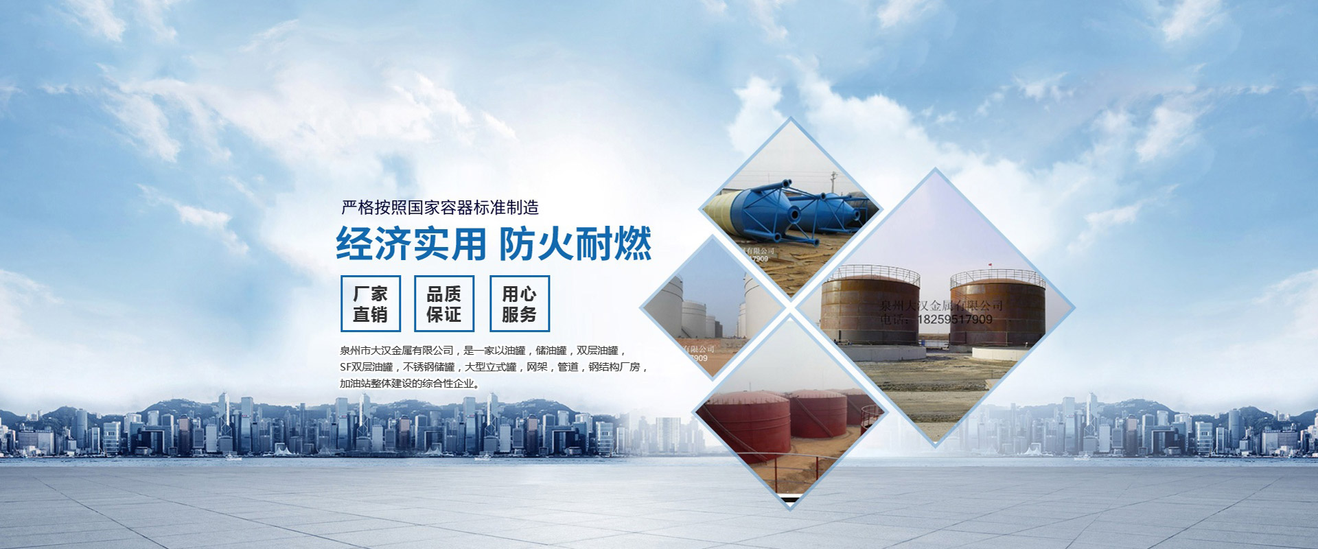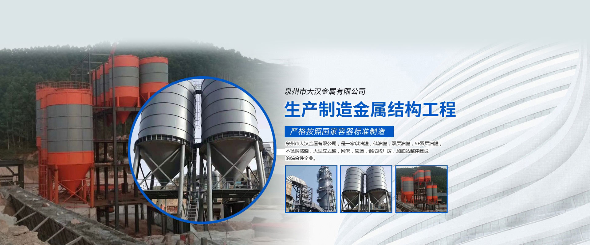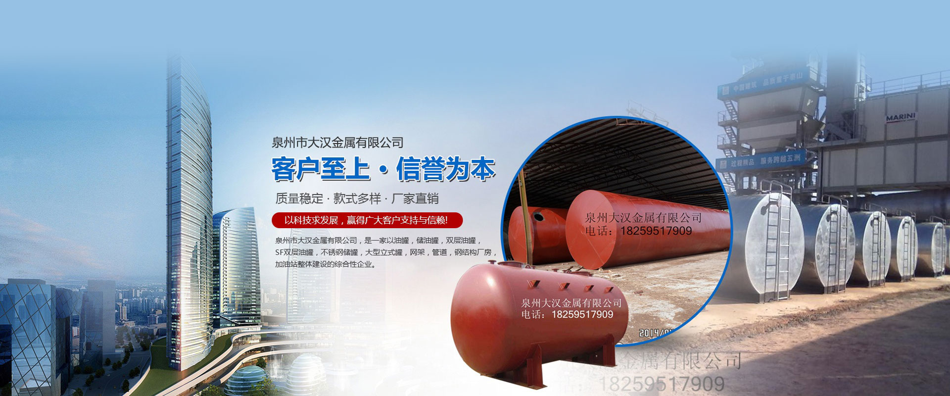 泉州市大漢金屬有限公司,是一家以油罐、儲油罐、雙層油罐、SF雙層油罐、不銹鋼儲罐、大型立式罐、網(wǎng)架、管道、鋼結(jié)構(gòu)廠房、加油站整體建設(shè)的綜合性企業(yè)。本公司以技術(shù)人員、施工經(jīng)驗豐富的工程隊、自動化設(shè)備、擁有鋼結(jié)構(gòu)建筑、螺栓球網(wǎng)架設(shè)計安裝技術(shù)力量,嚴(yán)格按照國家容器標(biāo)準(zhǔn)制造,是一家產(chǎn)品開發(fā)并生產(chǎn)各種壓力容器和制造金屬結(jié)構(gòu)工程,化工石油工程安裝的大型企業(yè)。近多年來,以質(zhì)量穩(wěn)定、客戶至上、信譽為本,以科技求發(fā)展,贏得廣大客戶支持與信賴。